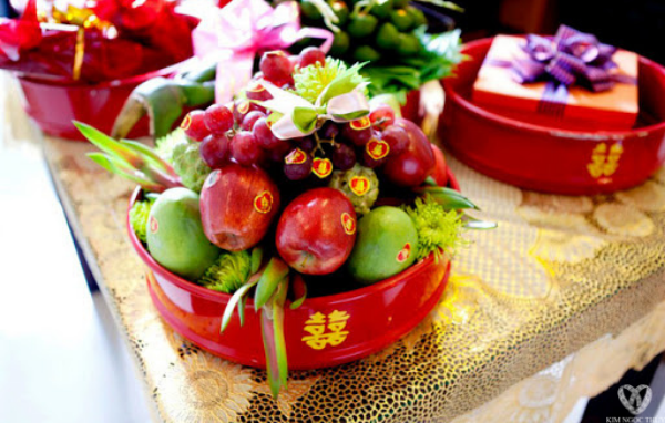 Trái cây: Là mâm quả phổ biến, quan trọng trong lễ vật cưới từ xa xưa đến ngày nay. Mâm quả trái cây thường gồm năm loại trái cây khác nhau. Đây là món quà tặng từ thiên nhiên mang ý nghĩa cầu mong cho tình yêu và cuộc sống của cô dâu chú rể sẽ ngọt ngào và tươi mới suốt cả phần đời còn lại. Tùy điều kiện kinh tế của gia đình nhà trai mf mâm quả có thể kết thành hai biểu tượng long phụng đẹp mắt. Mâm quả trái cây cần kiêng kỵ những loại trái cây như chuối, cam, lê, bom, lựu,.. và những loại trái có vị đắng, chát. Vì những tên gọi không phù hợp với ngày cưới, ngày đại hỷ