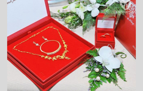 Khay trang sức cưới: Đây được ngụ ý là món quà giá trị gửi tặng đến cô dâu như mong muốn cảm ơn công lao nuôi dưỡng của ba mẹ nhà gái. Mâm quả bày tỏ chân thành, muốn cưới cô gái về làm vợ của chú rể. Sự chuẩn bị chu đáo gợi lên một cuộc hôn nhân viên mãn.
