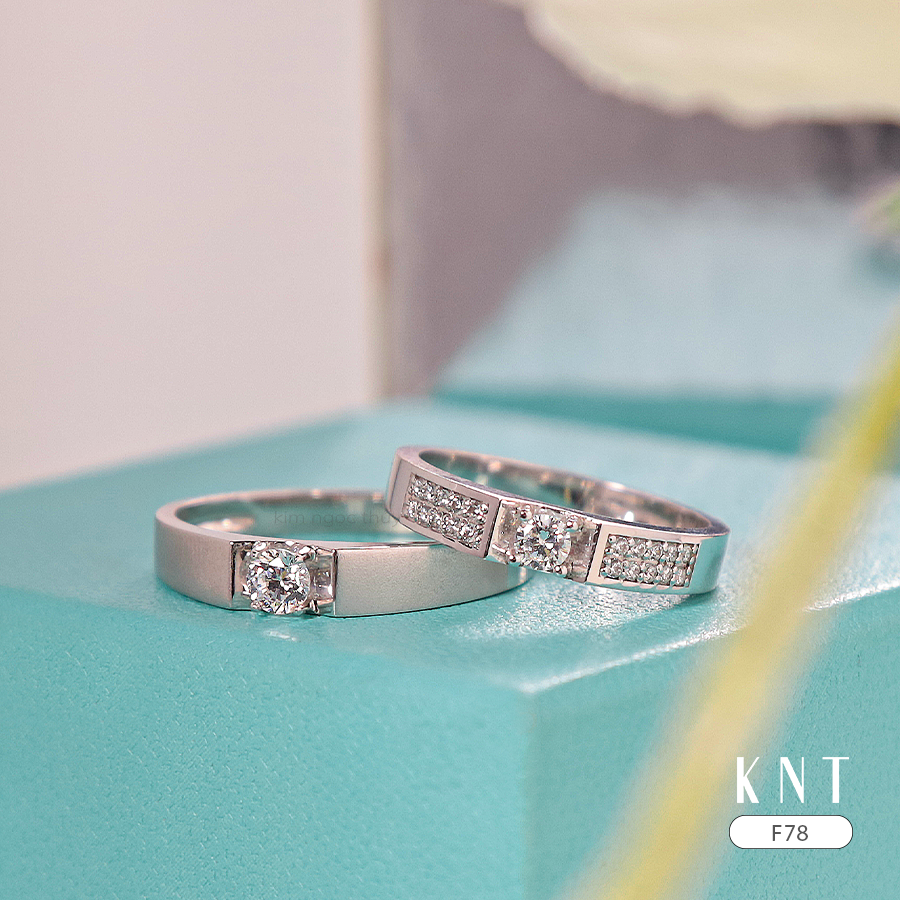 Nhẫn cưới F78 – Thiết kế mạnh mẽ nhưng không kém phần sang trọng,tinh tế – Nhẫn nam một hột chủ đơn giản, nam tính – Nhẫn nữ kết hợp thêm hàng hột tấm 2 bên.Tạo điểm nhấn và làm bật lên nét sang trọng.