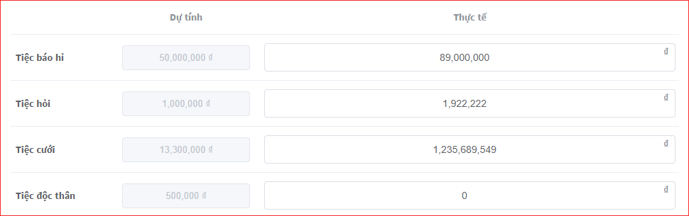Nhập tiền mừng thực tế của khách mời để dễ dàng so sánh chênh lệch tiền mừng các Tiệc cưới, Tiệc hỏi,..