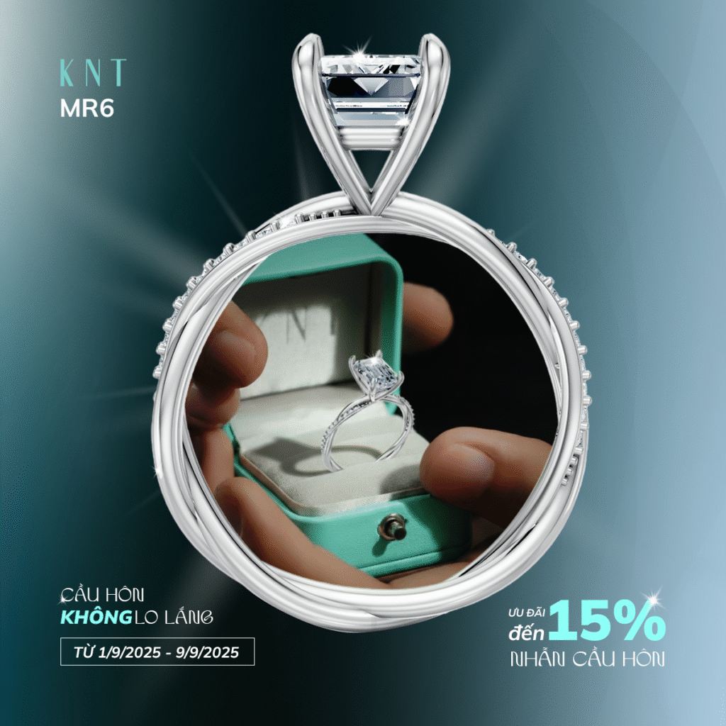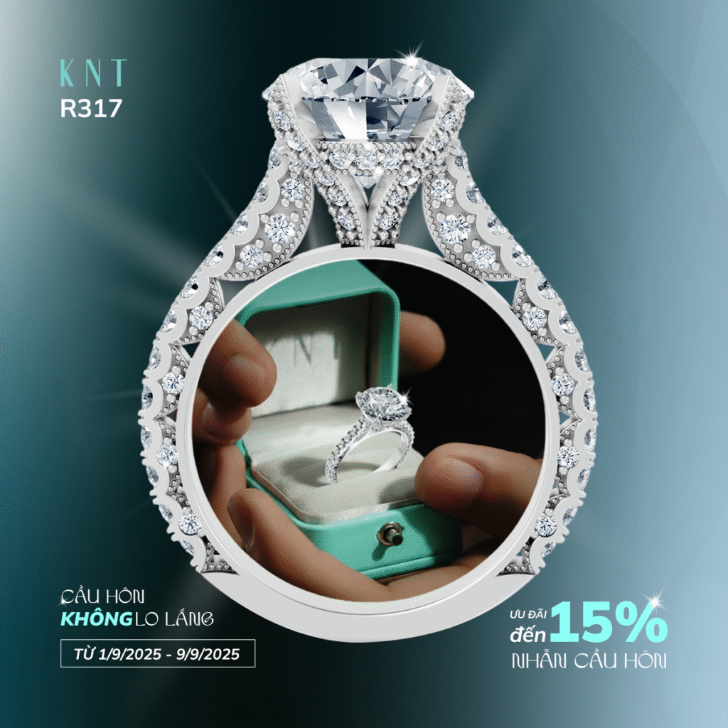 👉 Nhanh tay đến với KNT từ 1/9 – 9/9/2025 để nhận ngay ưu đãi giảm đến 15% nhẫn cầu hôn và biến khoảnh khắc cầu hôn trở thành kỷ niệm vĩnh cửu! Ghé thăm showroom hoặc liên hệ ngay với Kim Ngọc Thủy để được tư vấn mẫu nhẫn phù hợp nhất.